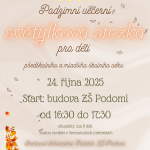 Zveme všechny děti předškolního a mladšího školního věku i jejich rodiče na Podzimní večerní světýlkovou stezku, kterou pro vás připravují někteří žáci druhého stupně.